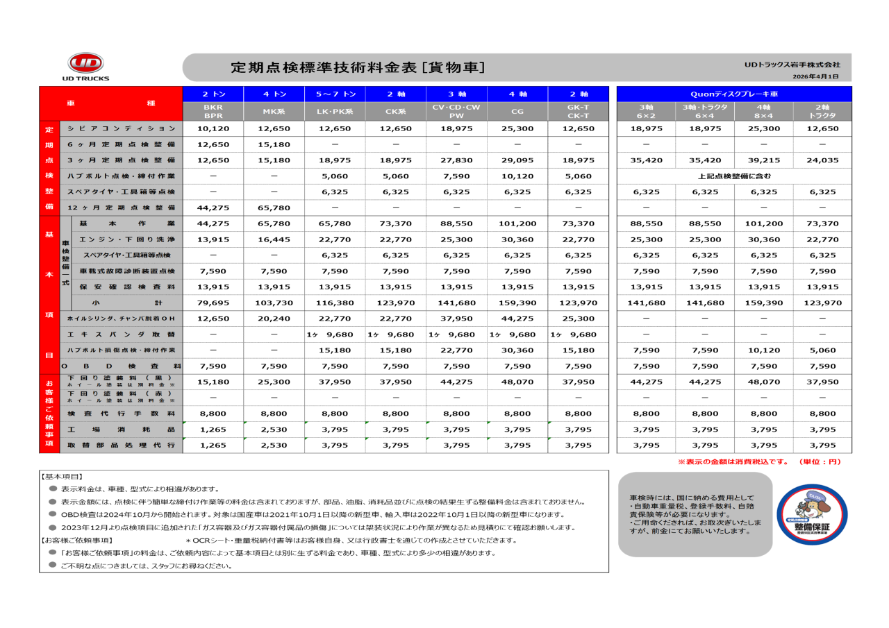 点検整備料金表
